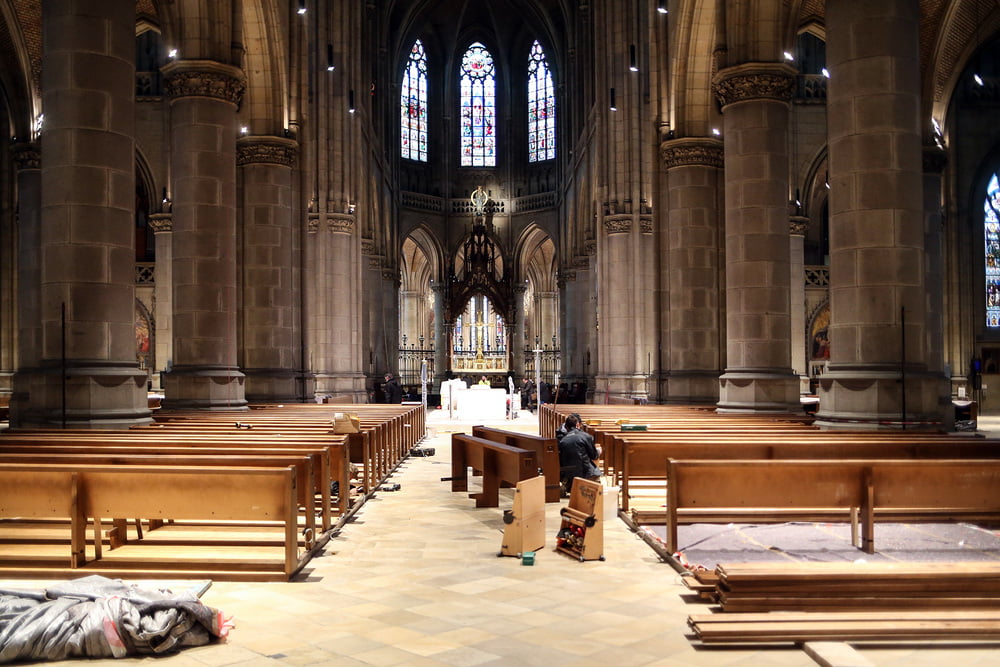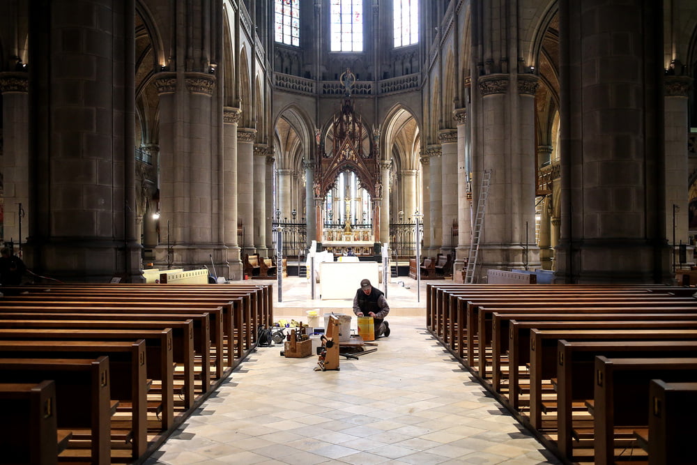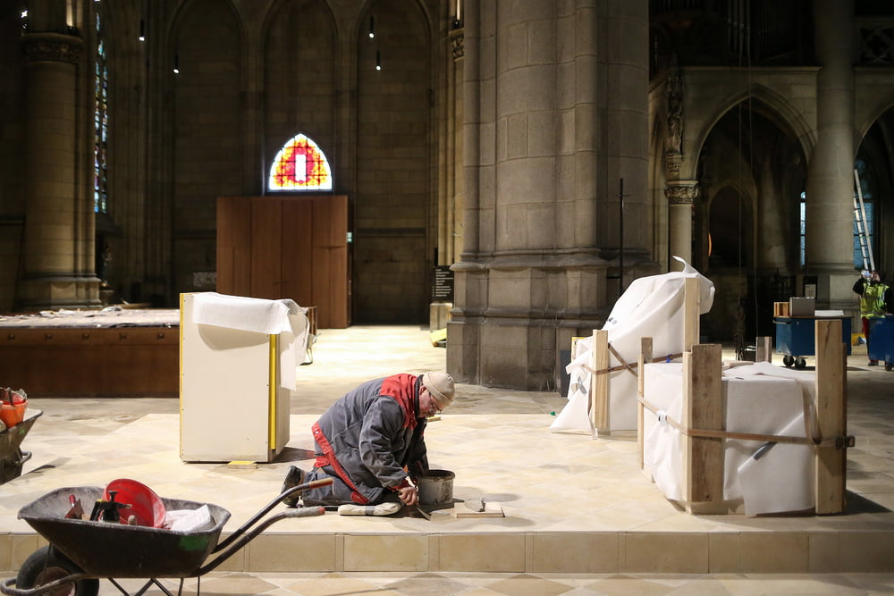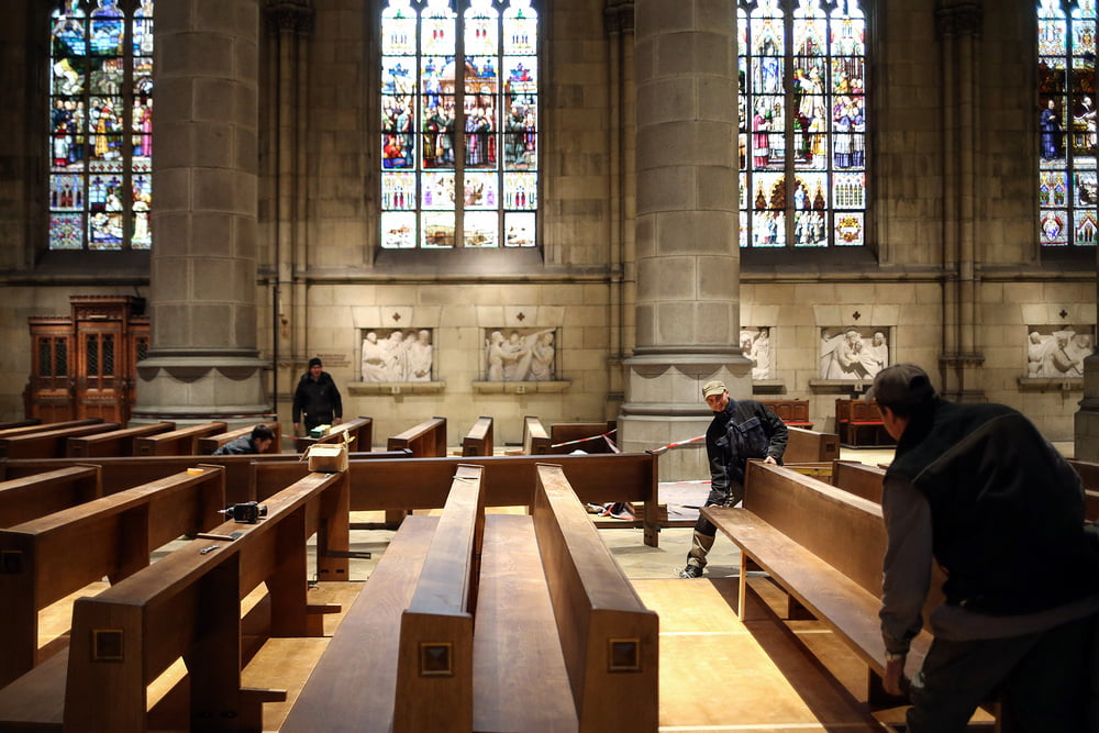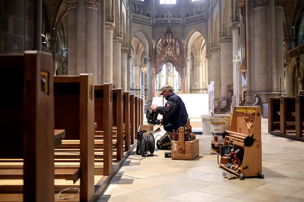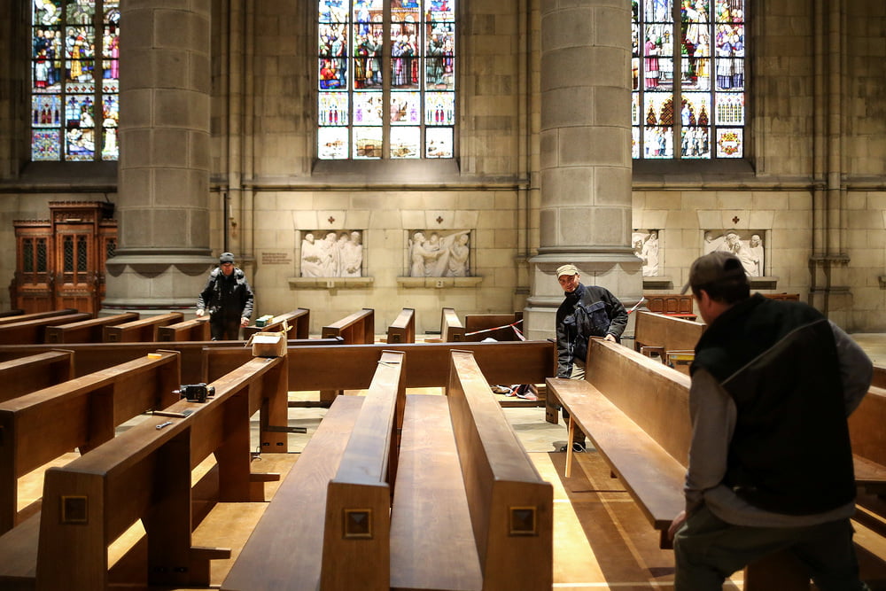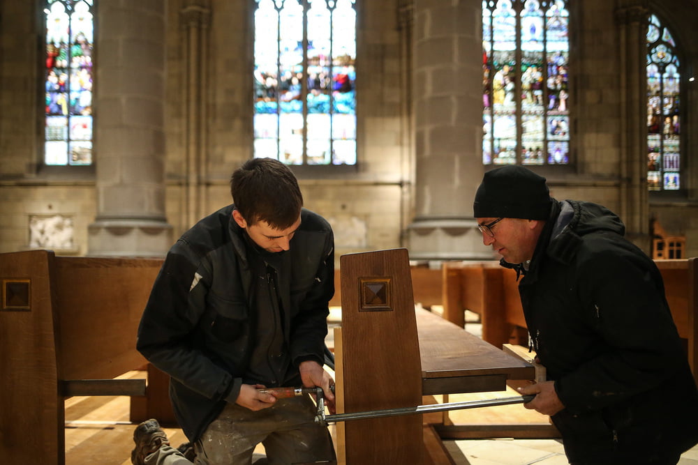 Geschraubt, gehobelt und gesägt wird an den Sitzbänken - damit sie den richtigen Platz und Halt finden und die Gottesdienstgemeinde später ihren Platz.