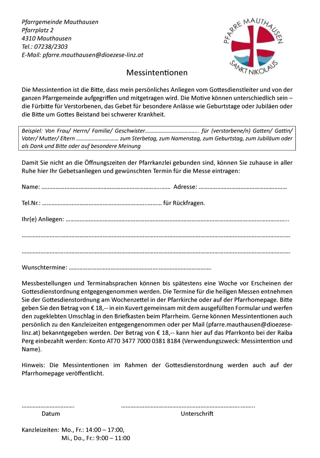 Da es nicht immer möglich ist, zu den Bürozeiten in das Pfarrheim zu kommen, liegen seit kurzem Formulare zum Bestellen von Messintentionen bei den Kirchentüren zum Mitnehmen auf bzw. finden Sie dieses auch HIER zum Herunterladen. Zuhause in Ruhe durchlesen und ausfüllen und in den Postkasten beim Pfarramt werfen.