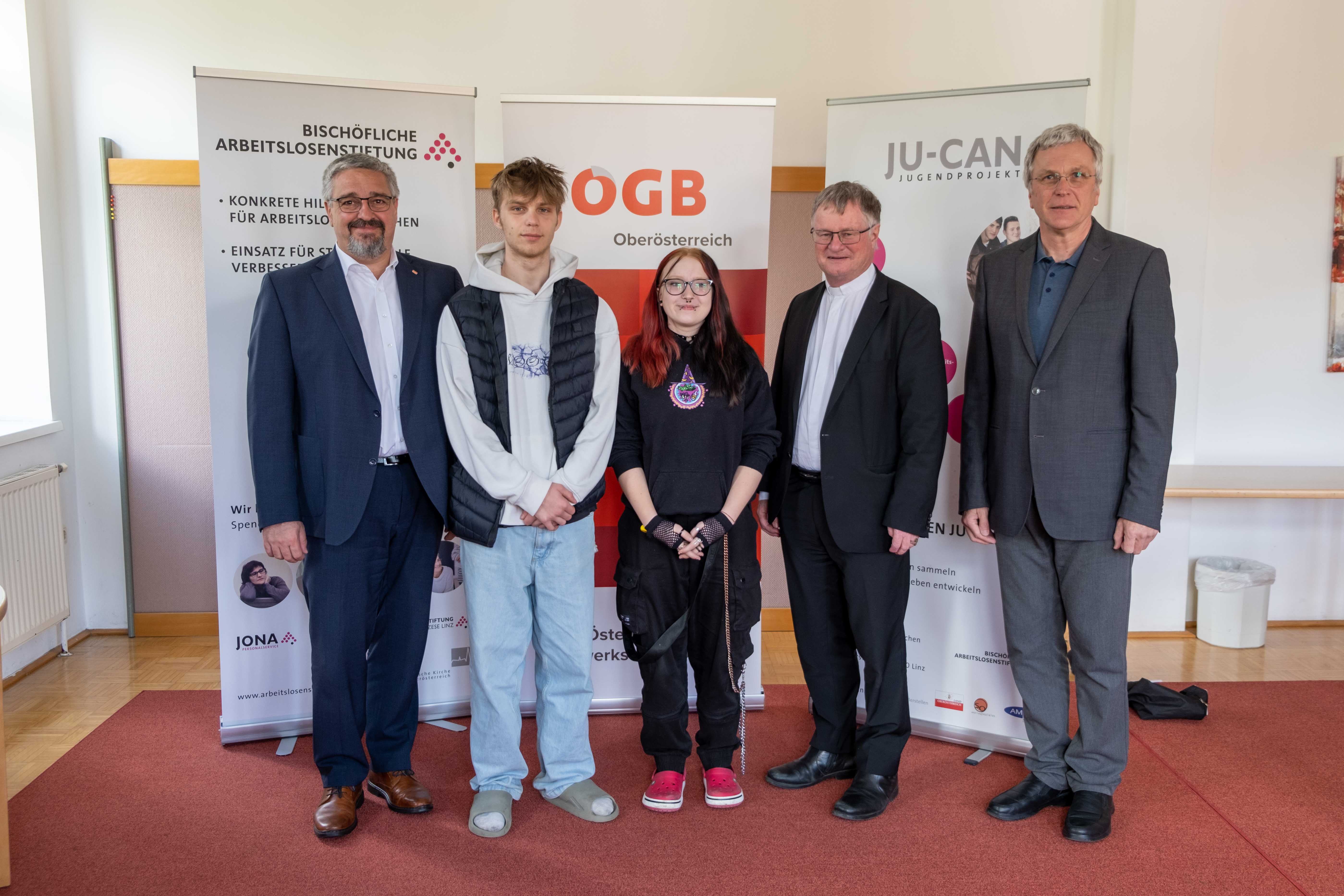 Foto 4: v.l.: Nico Haider, Teilnehmer Jugendprojekt JU-CAN; Isabella Freilinger, Teilnehmerin Jugendprojekt JU-CAN; Christian Winkler, Geschäftsführung Bischöfliche Arbeitslosenstiftung; Bischof Manfred Scheuer und Andreas Stangl, ÖGB-Landesvorsitzender.
